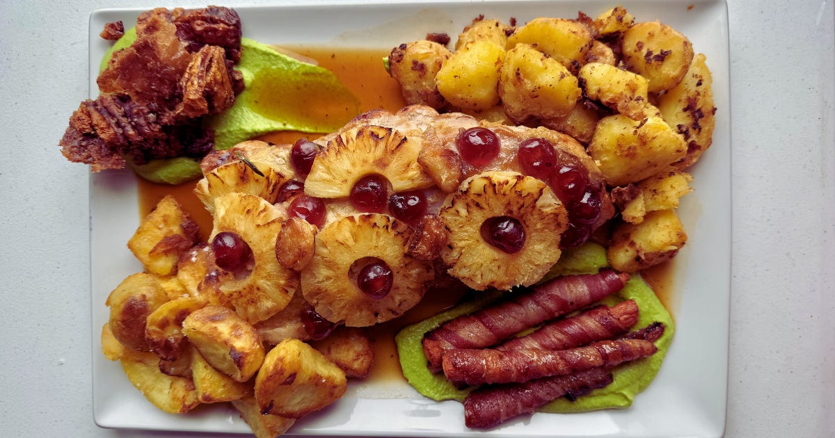 Retro Roast Pork with Pineapple, Cherries and Shatter Crackling